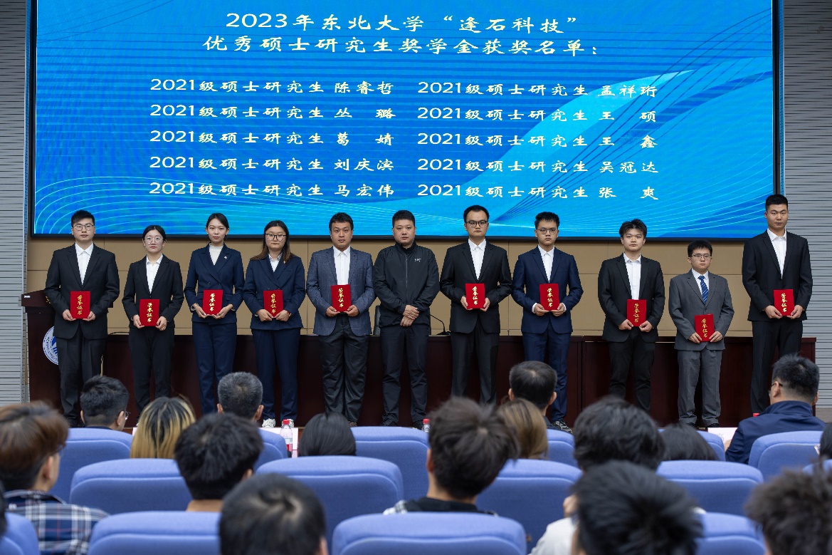 马天威宣读了关于颁发2023年东北大学“逢石科技”奖学金的决定和获奖学生名单,2020级博士研究生安亚雄等14人获得了奖学金。