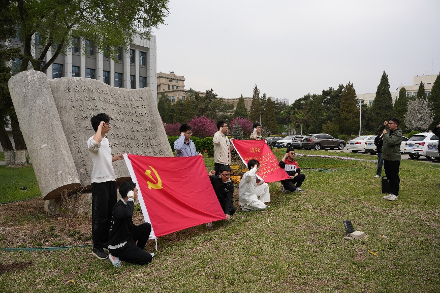 艾国生和李季带领学生党员共同种下第一棵树,并将“植树林”立牌授予学生党员代表。