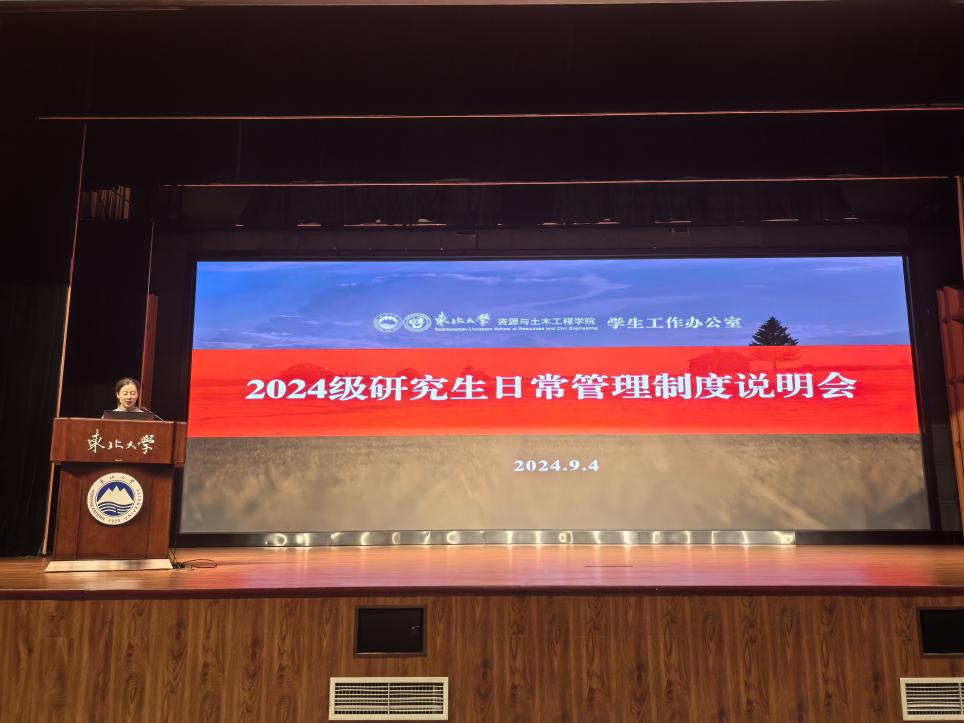 9月4日,资源与土木工程学院2024级研究生新生“开学第一课”于汉卿会堂蔡冠深报告厅举行。学院副院长于庆磊,党委副书记、副院长(兼)刘婉婷,教学科研办公室副主任王娜,教学秘书谢楚君出席活动。会议由学生工作办公室主任吴迪主持。