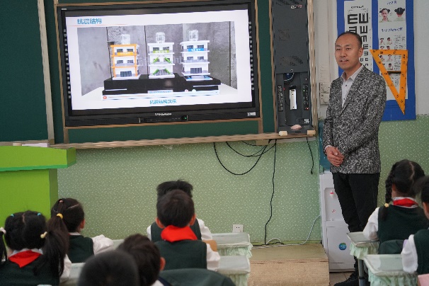 科普课堂上,陈猛以《房屋抗震原理及安全逃生》为题,讲解了地震成因、建筑抗震技术及逃生技巧。姚烨以《走进名胜古迹——学做未来建筑师》为题,带领学生“云游”故宫、长城和金字塔,揭秘古建筑智慧,鼓励学生以未来建筑师的视角思考文化遗产保护与创新设计。