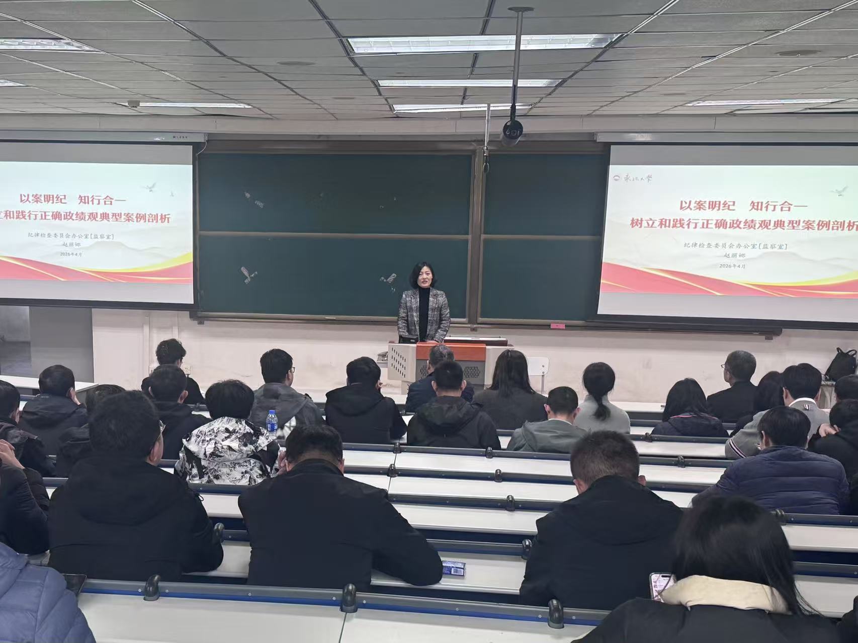 赵丽娜以《以案明纪 知行合一,树立和践行正确政绩观典型案例剖析》为题开展宣讲。解读了正确政绩观的核心要义,结合不同岗位职责,明晰履职价值与廉洁底线。同时,围绕学术不端、科研经费违规、师德失范等六大类别,结合法规条文与典型案例,剖析招生评优、项目申报、经费使用等关键领域廉政风险,警示全体教职工敬畏纪律、廉洁从教。
