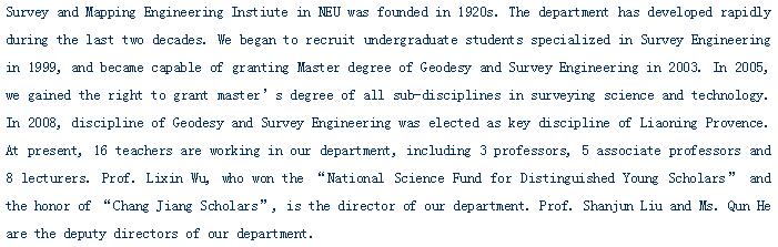Teaching:We have 4 bachelor degree and master degree programs in Surveying Science and Technology, including Geodesy and Survey Engineering, Cartography and Geographic Information Engineering, Photogrammetry and Remote Sensing, mining and underground measurement. We also have a doctoral degree program specialized in digital mining engineering. There are roughly 5 PhD students, 20 master students and 55 undergraduates joining our programs every year.